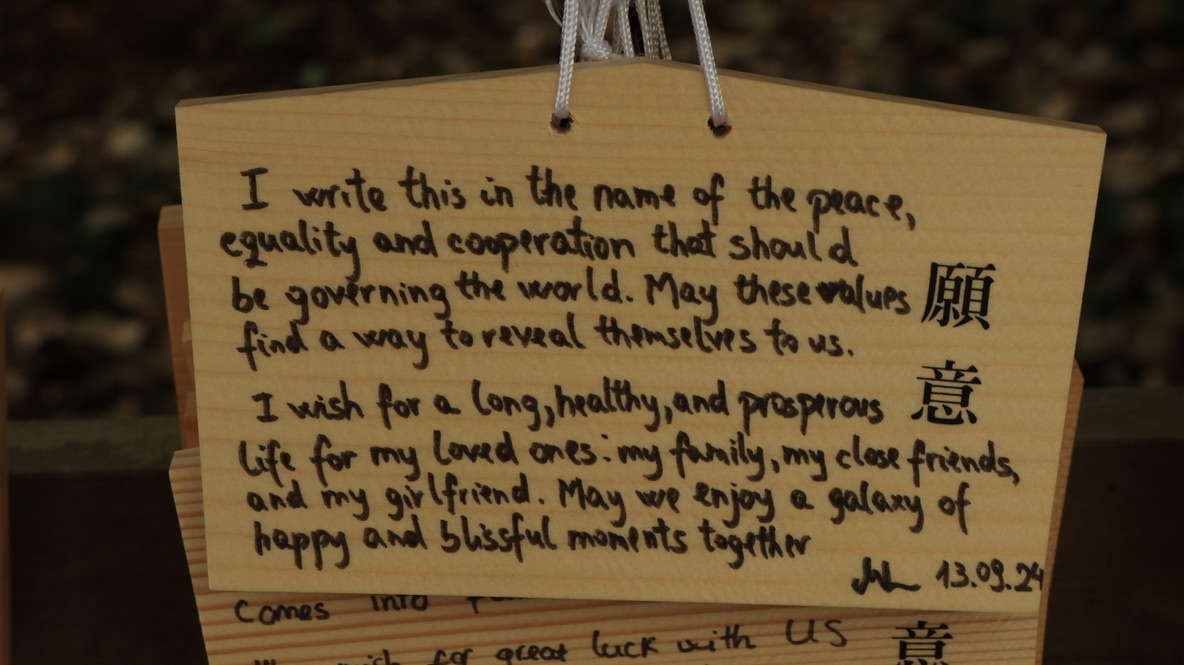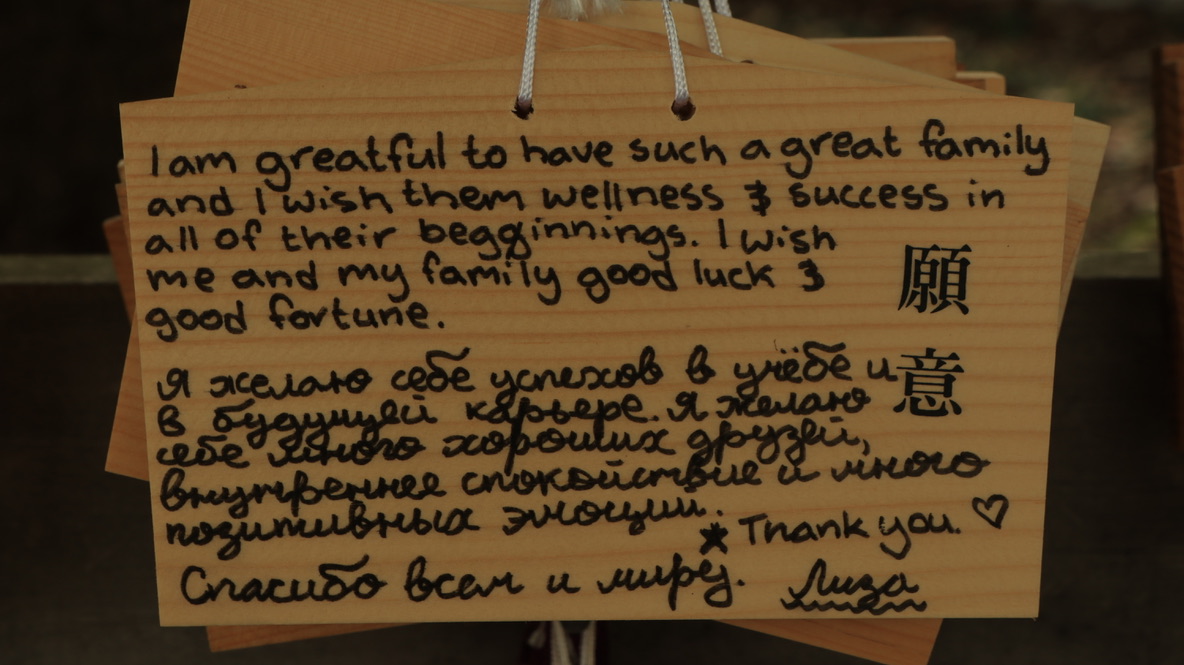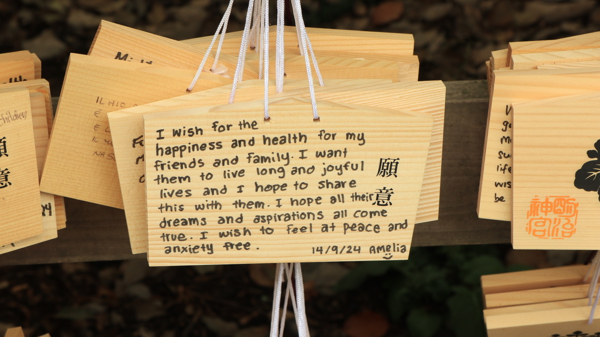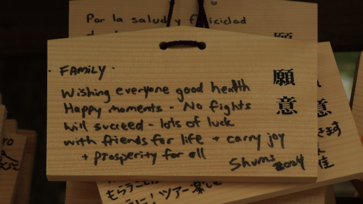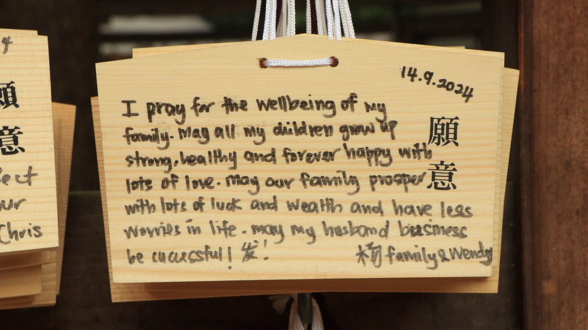 神树下挂满了绘马,我在树下驻足良久,几乎看了所有的牌子。我发现,无论何种语言、肤色、年龄阶段的人们其实只有一个共同的朴素的心愿——“希望自己和家人身体健康,平安喜乐”。