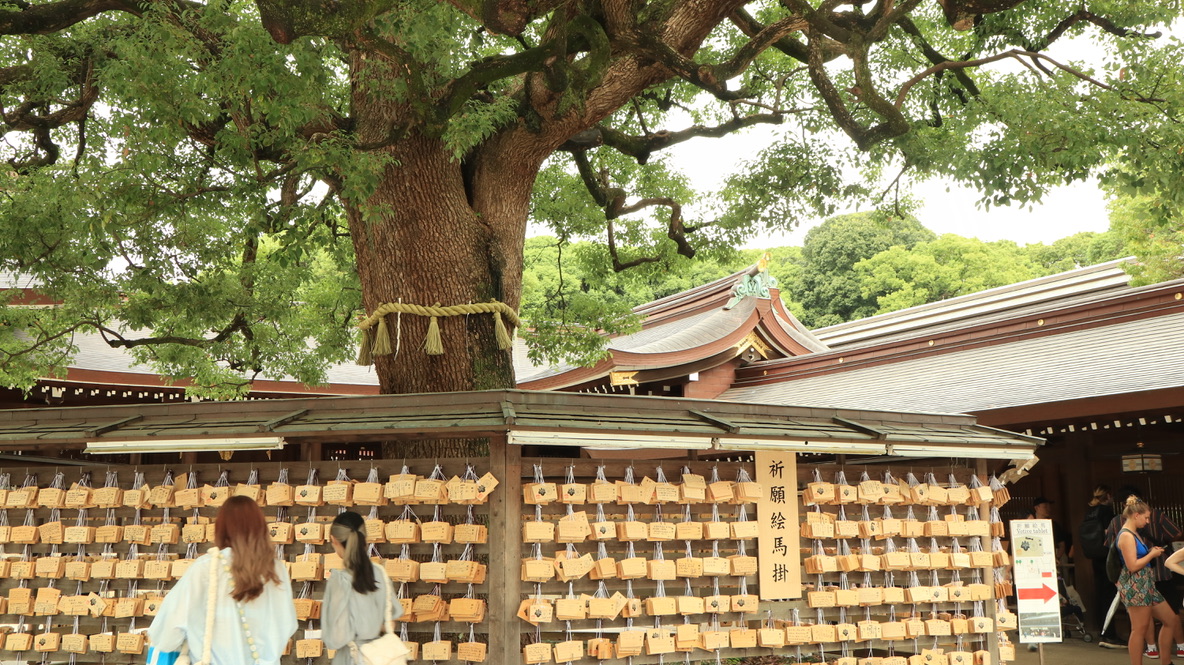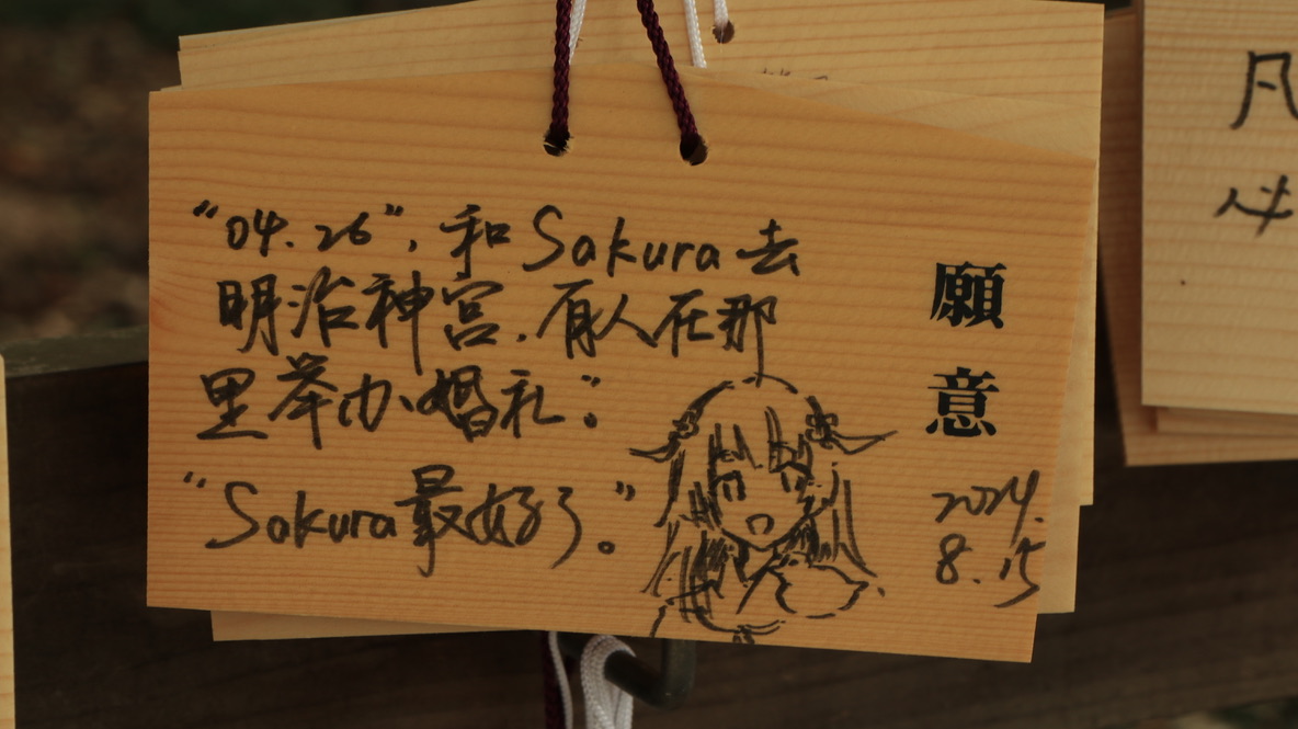 “绘马”是一种用于许愿的小木牌,起源于日本神道教。人们在木牌的一面写下自己的愿望或祈祷,然后将其悬挂在神社或寺庙指定的地方,即“绘马挂所”。明治神宫的绘马非常有特色,上面印有神社的标志——巨大的木制鸟居 和 菊花御纹章(日本皇室的家徽)。