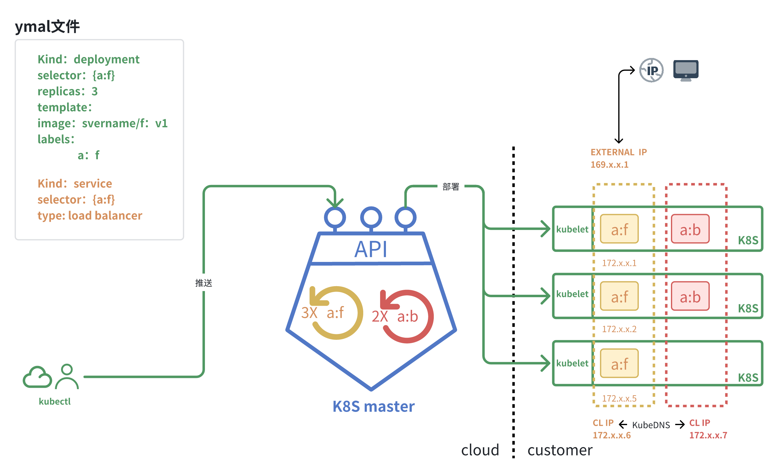 - 部署:部署控制容器化应用程序的创建和状态,并保持其运行。它指定集群上应运行多少个 Pod 副本。如果 Pod 失败,部署会创建一个新的。