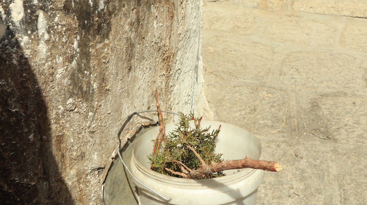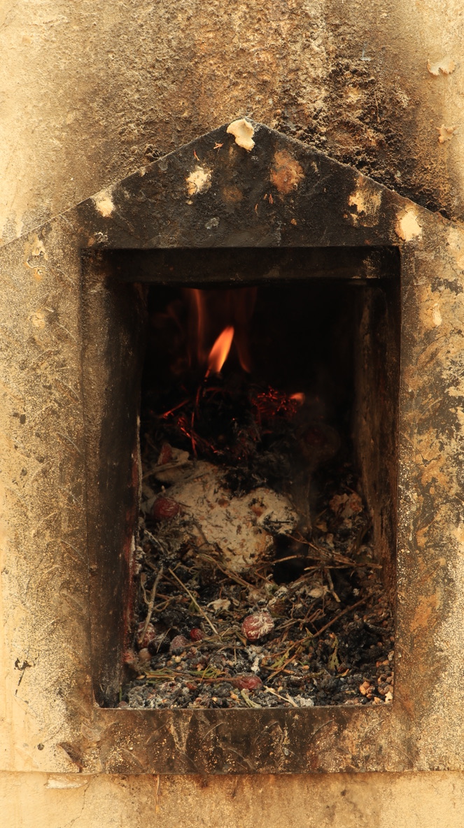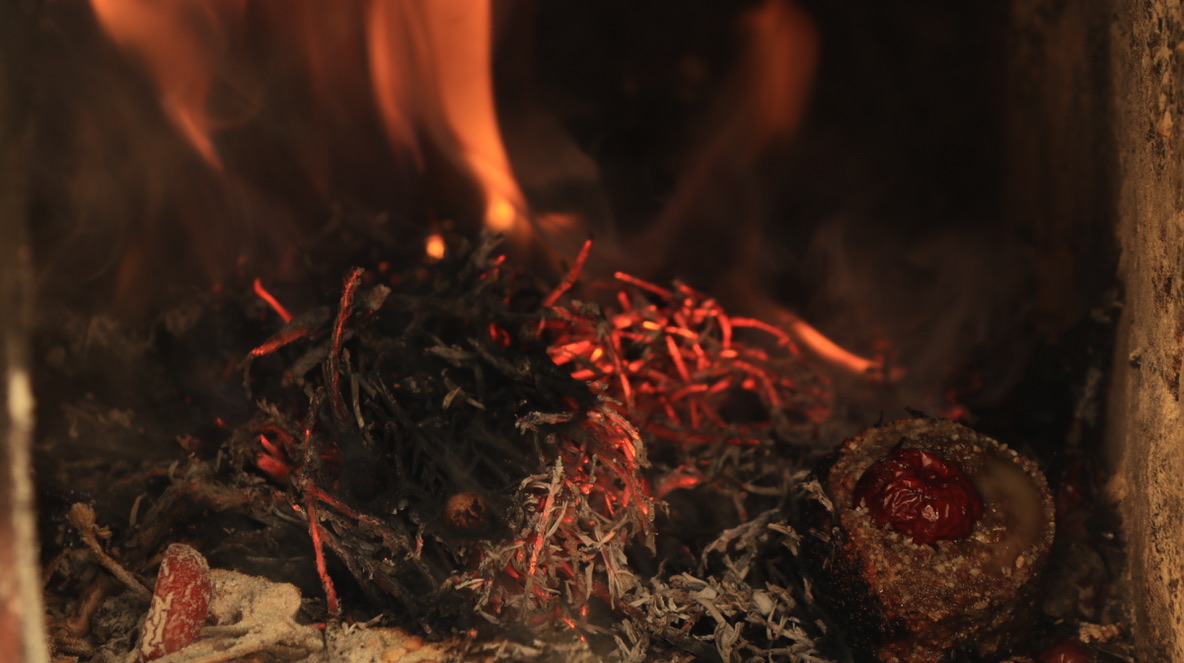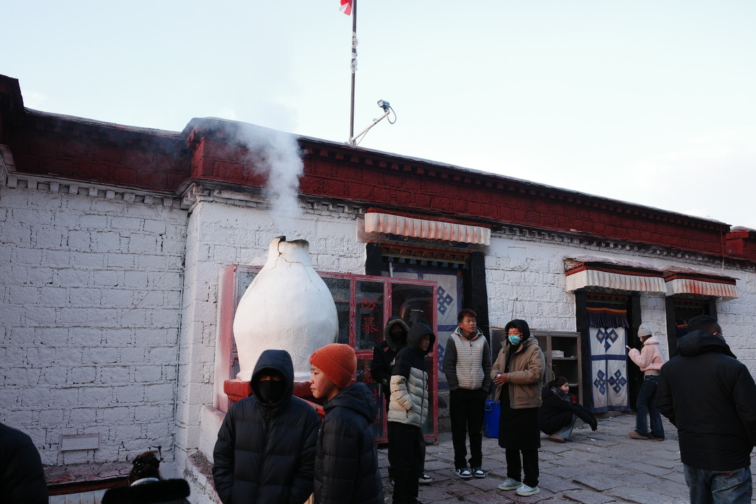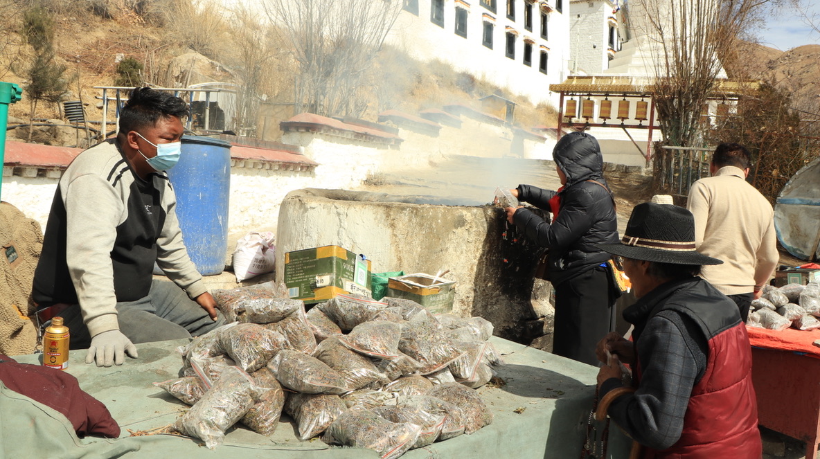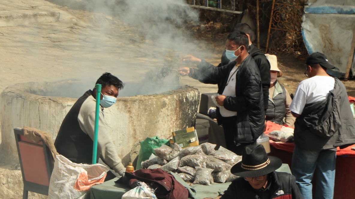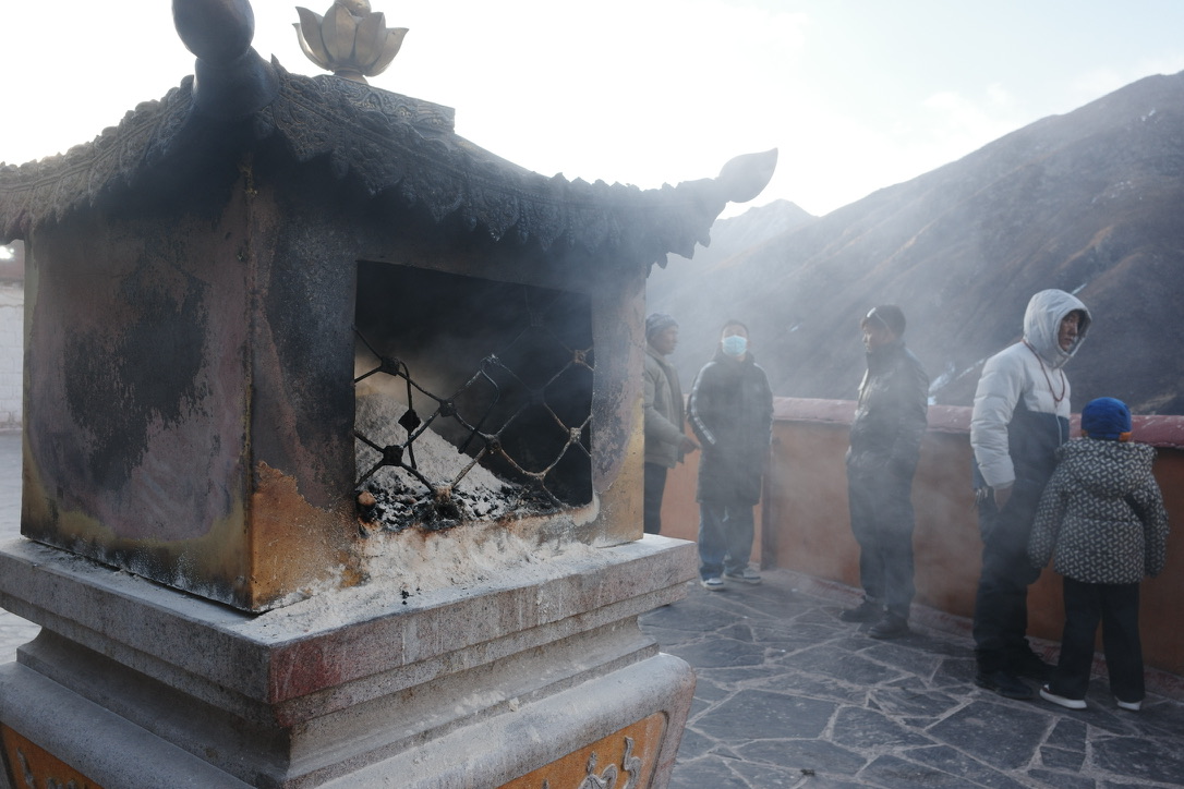 寺庙门口,焚烧松枝松叶,撒青稞粉与水