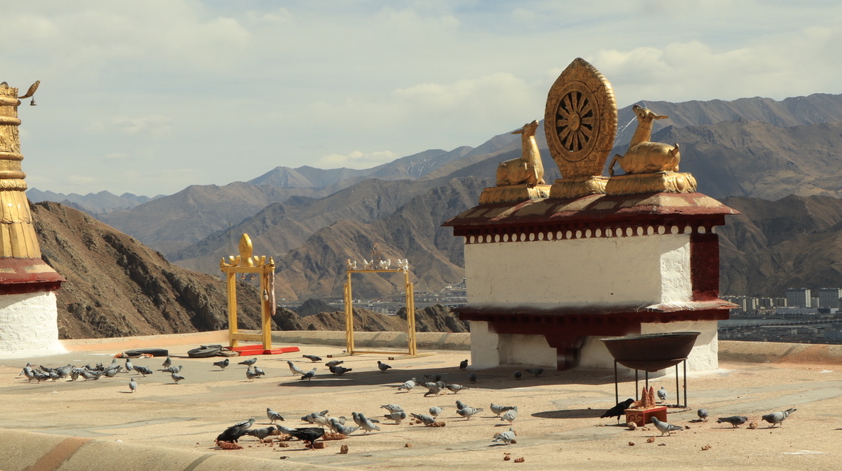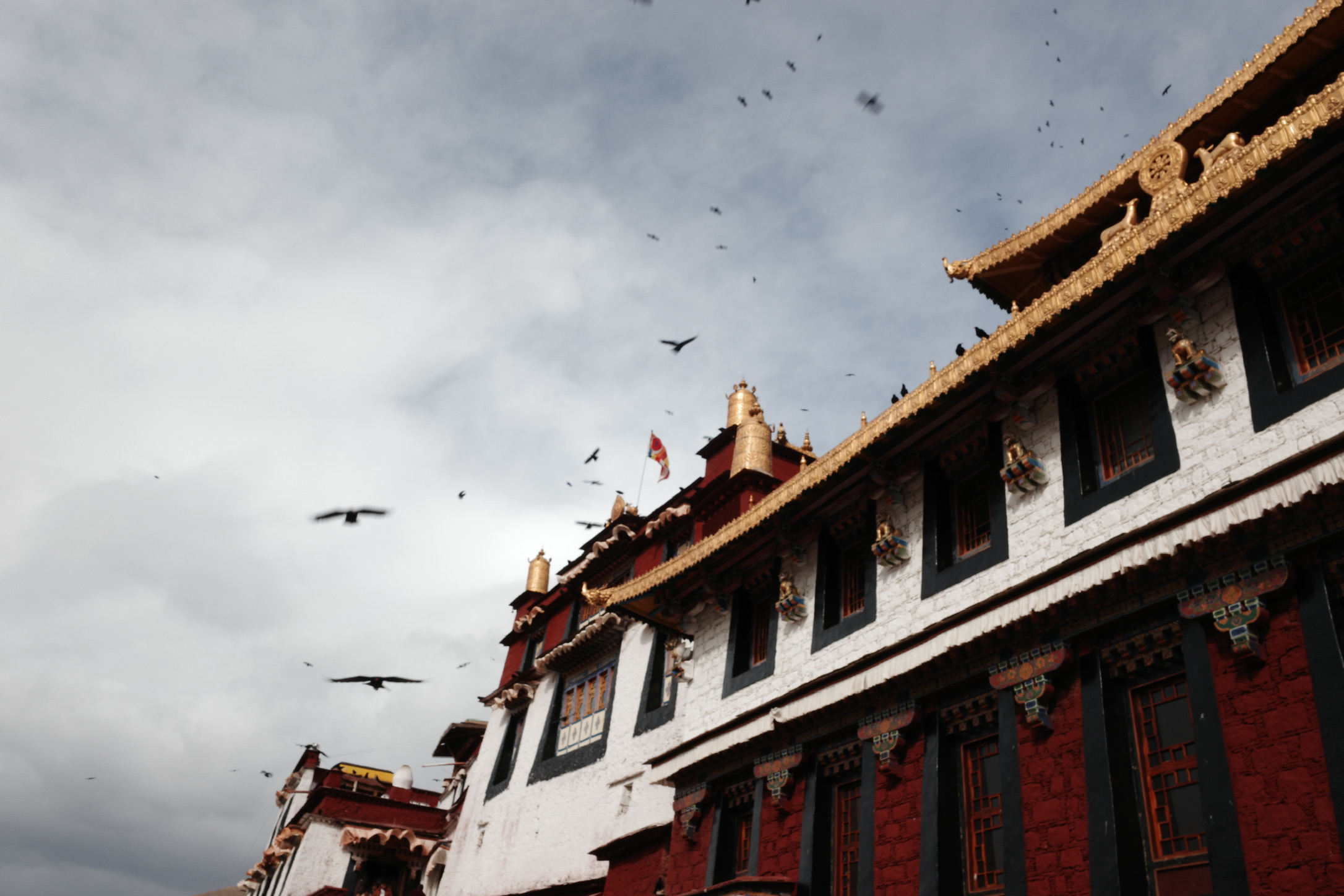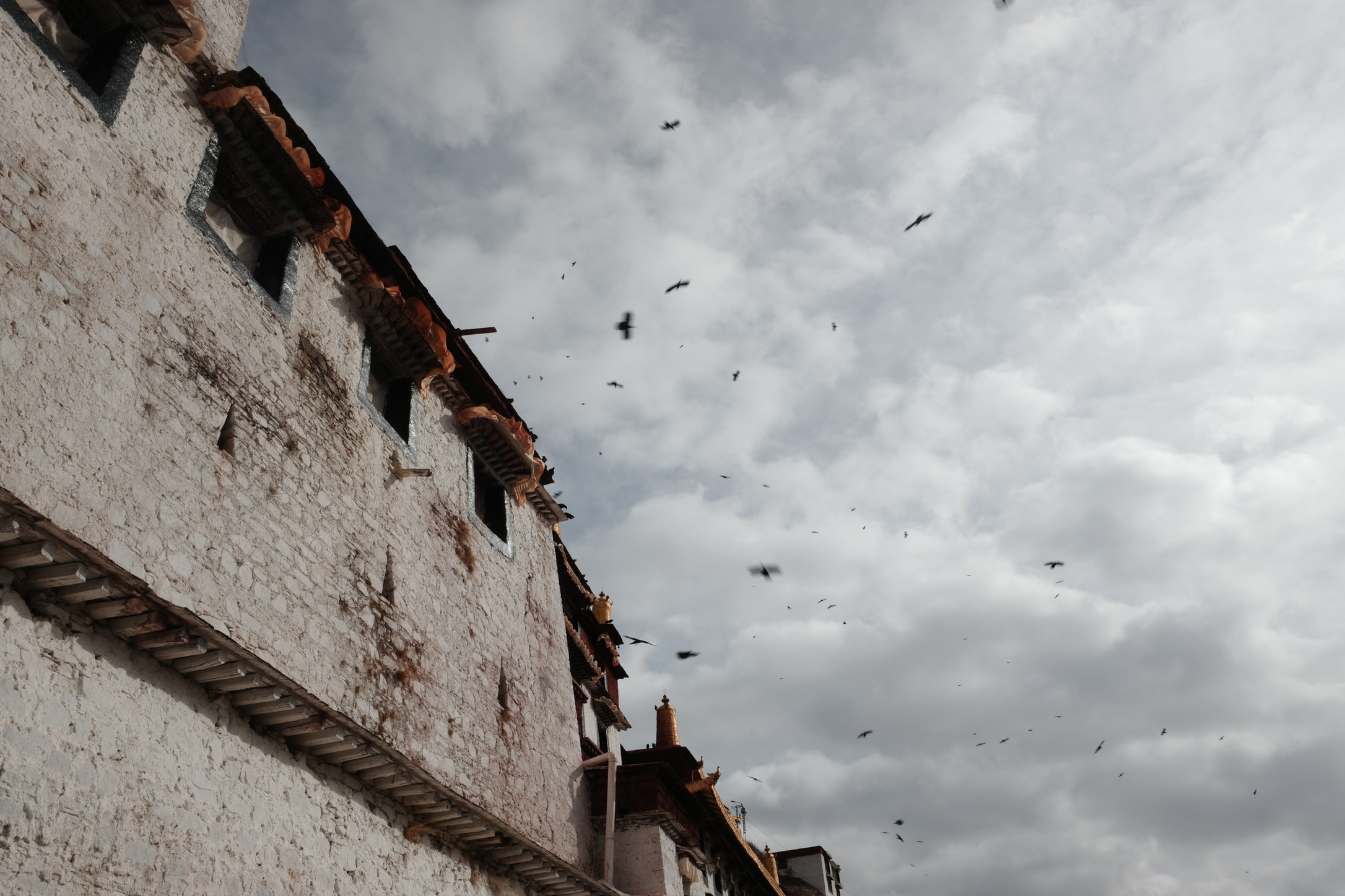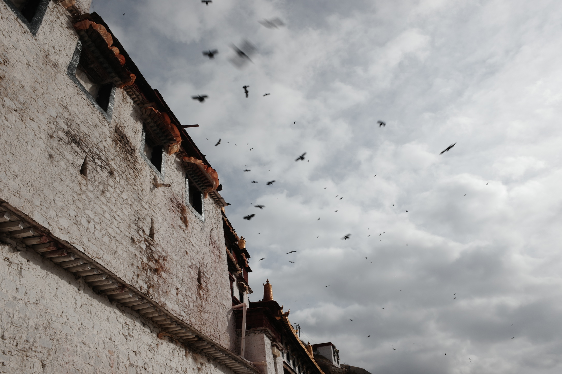 在寺庙的壁画中,有一副描述布达拉宫红宫建成时仙鹤在空中飞翔,天空撒下花瓣雨;有一副描述五世达赖在布达拉宫白宫周围降下一圈乌云……在看到壁画时,我感觉这只是宗教艺术上的美化,直到我亲眼在拉萨城郊见到成群的黑颈鹤—世界上唯一在高原繁殖和越冬的鹤类,这里是他们的冬季栖息地;直到我亲眼见到拉萨飘雪时,从后方山峦降下包围逼近布达拉宫的乌云…..才惊觉壁画原来是写实。
