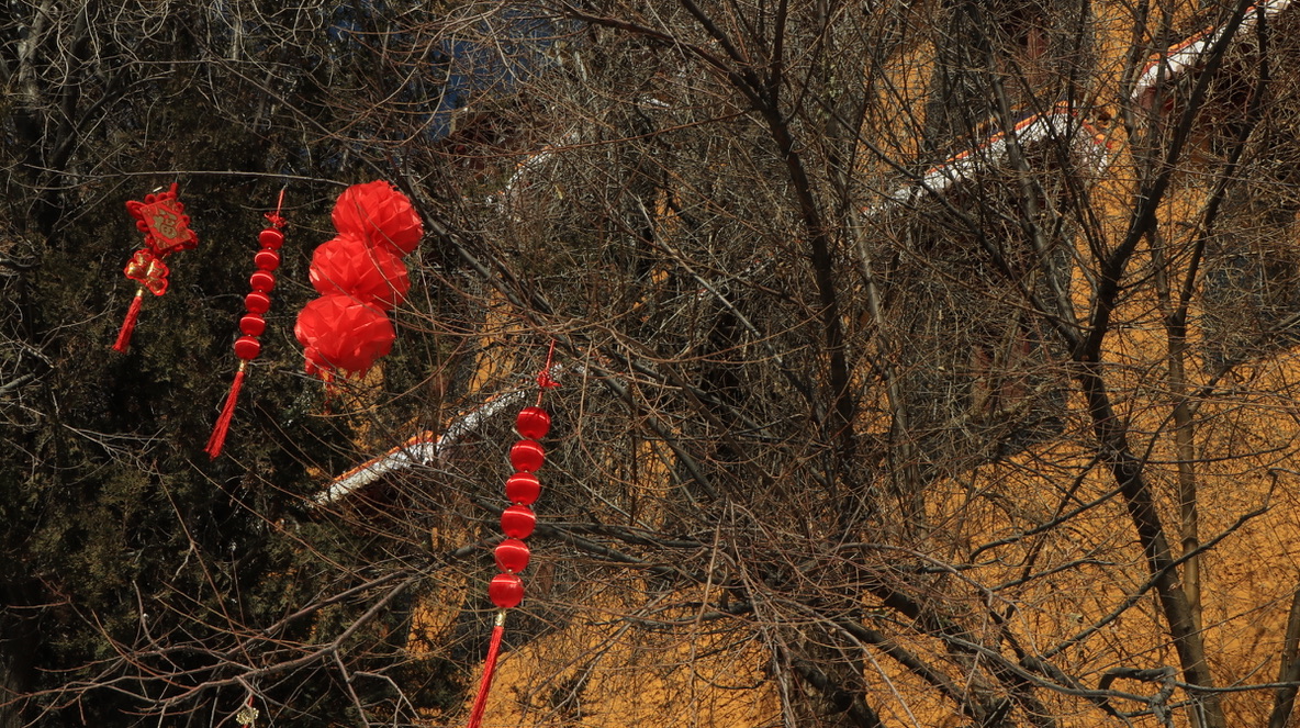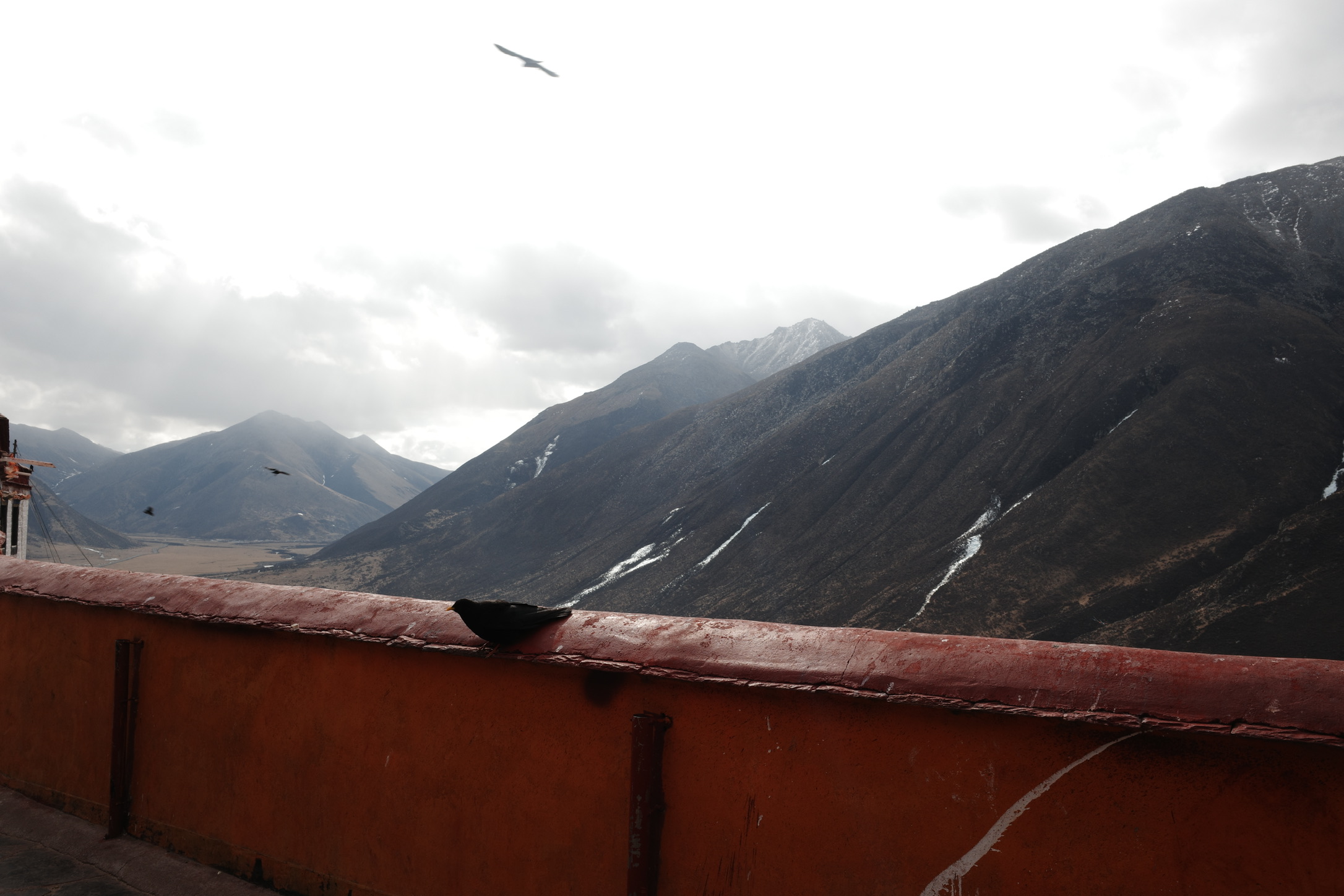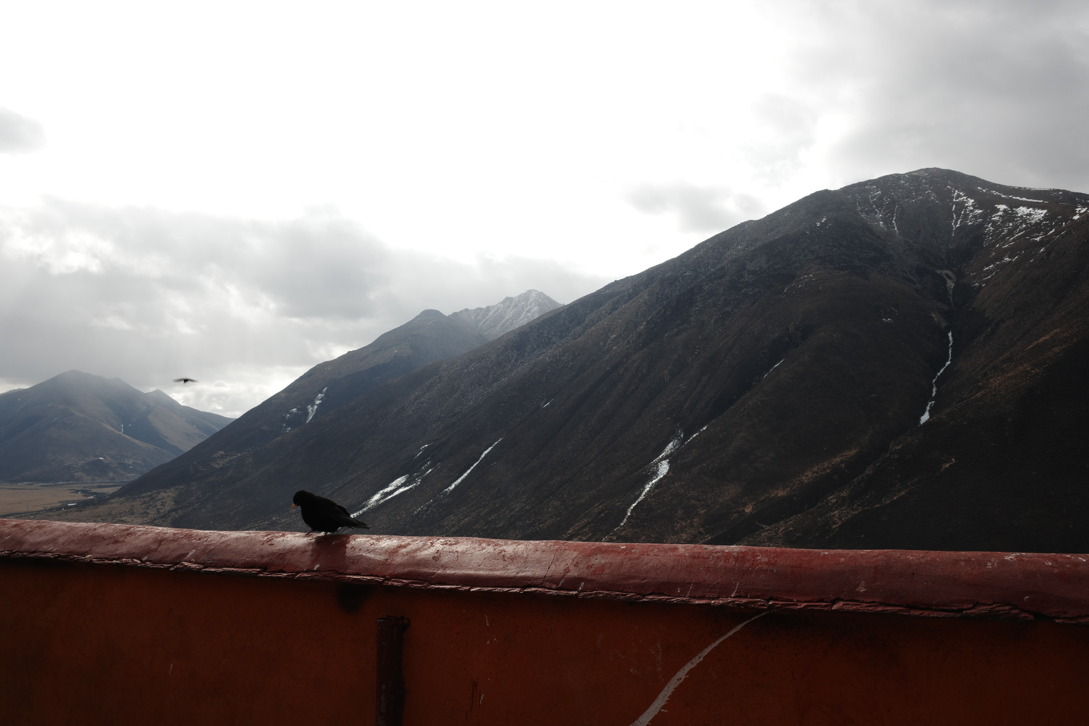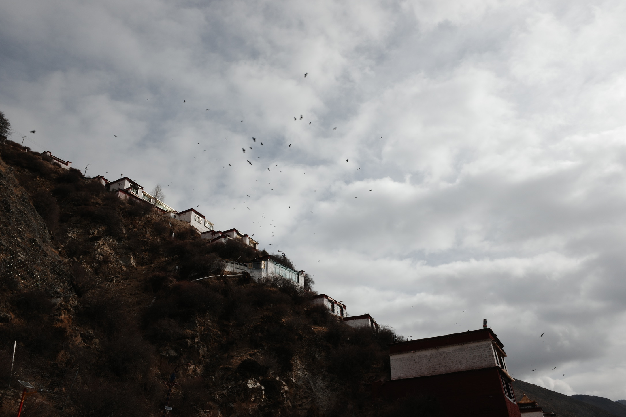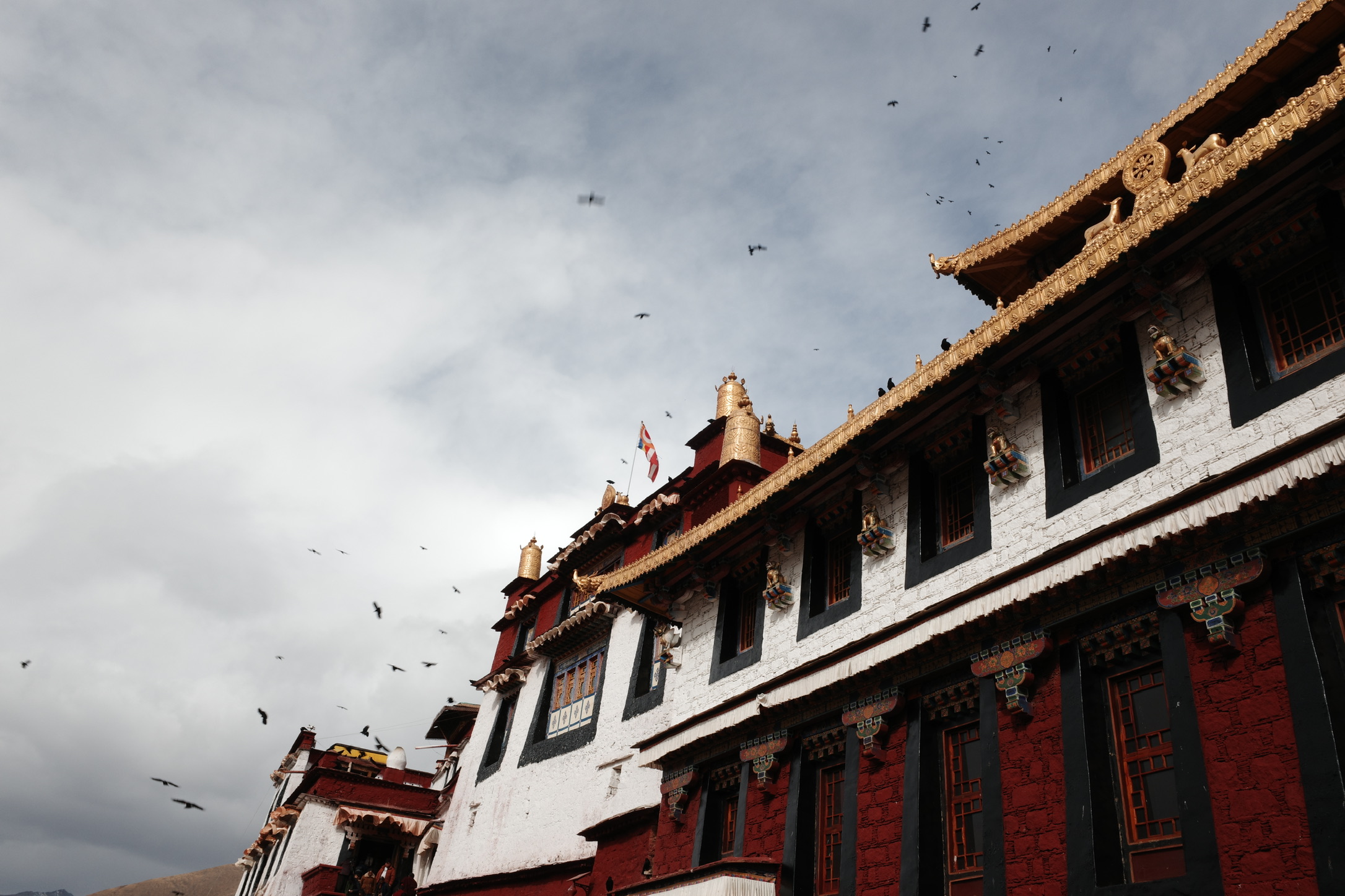在寺庙的壁画中,有一副描述布达拉宫红宫建成时仙鹤在空中飞翔,天空撒下花瓣雨;有一副描述五世达赖在布达拉宫白宫周围降下一圈乌云……在看到壁画时,我感觉这只是宗教艺术上的美化,直到我亲眼在拉萨城郊见到成群的黑颈鹤—世界上唯一在高原繁殖和越冬的鹤类,这里是他们的冬季栖息地;直到我亲眼见到拉萨飘雪时,从后方山峦降下包围逼近布达拉宫的乌云…..才惊觉壁画原来是写实。