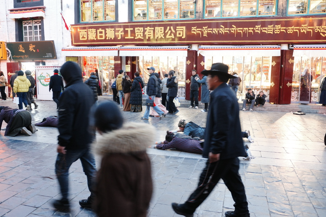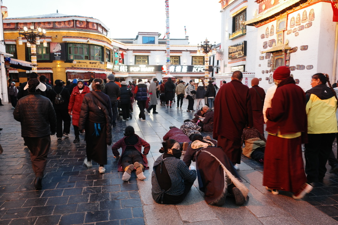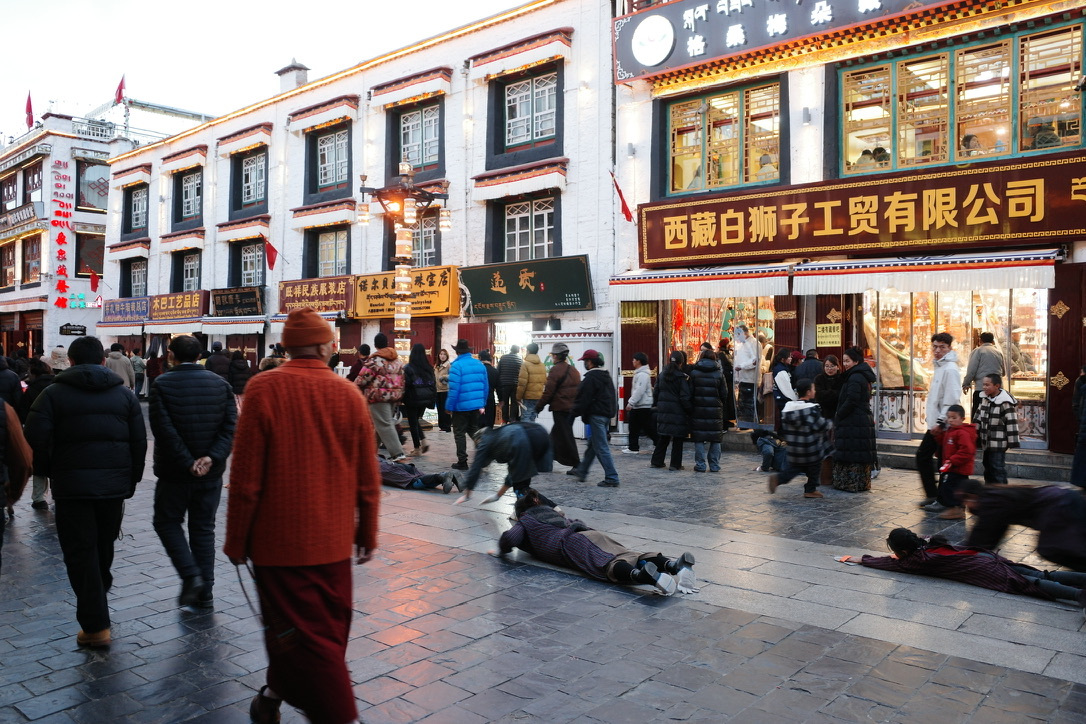 于是在大昭寺前和周围,有许许多多磕长头的朝拜者,无论年幼或年迈,他们用身体丈量着到圣城的距离,那些寒冷、饥饿、赃污泥泞、身体淤青的疼痛都被抛诸脑后,他们此生最大的心愿就是能磕一次长头到达大昭寺亲见释加牟尼等身像,他们的付出中所许心愿不是为自己,而是为世界和平众生解脱,为那些没有条件来到佛祖面前的人祈愿。