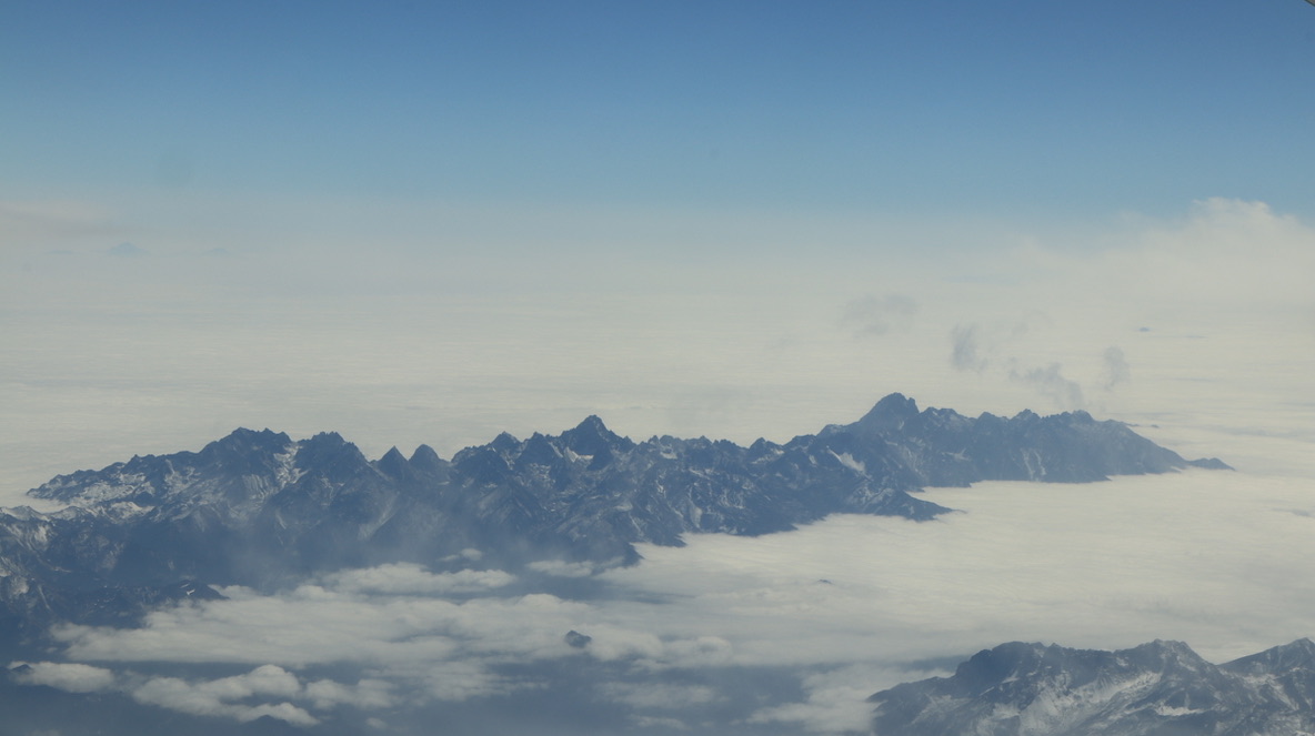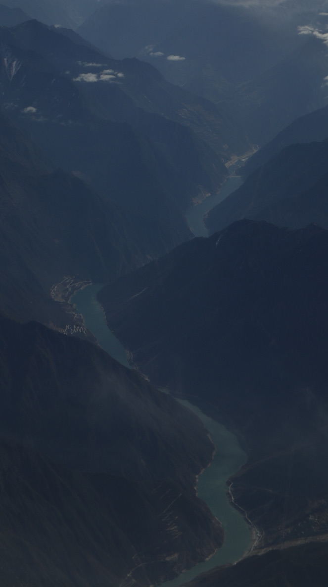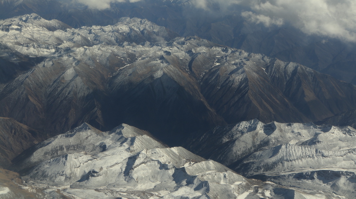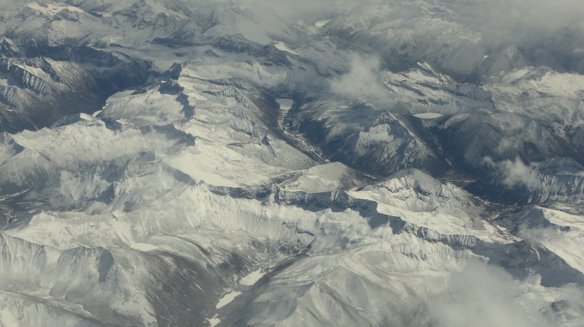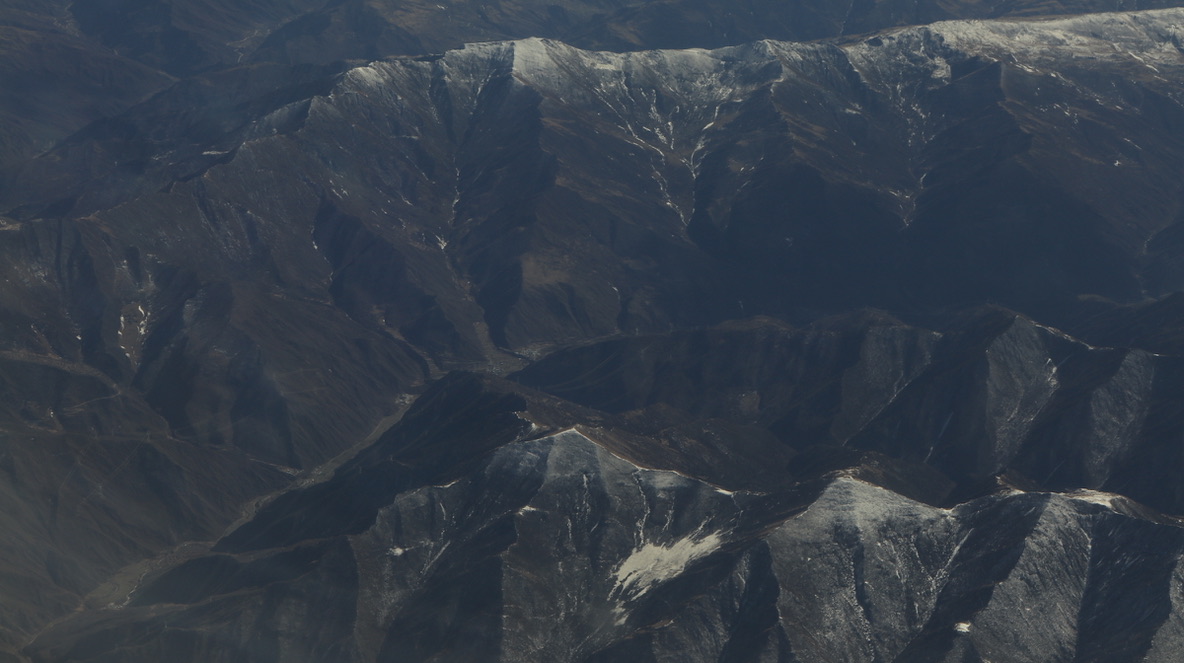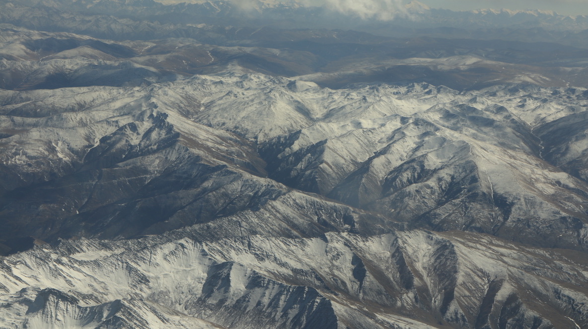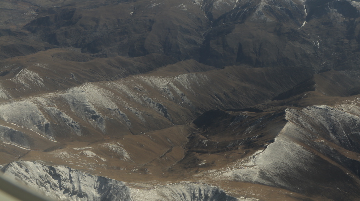 临近拉萨时,在飞机上可见青藏高原特殊的地貌,地壳板块的垂直隆起,一层一层被积雪勾勒得十分清晰,像一面面巨大的幕墙。