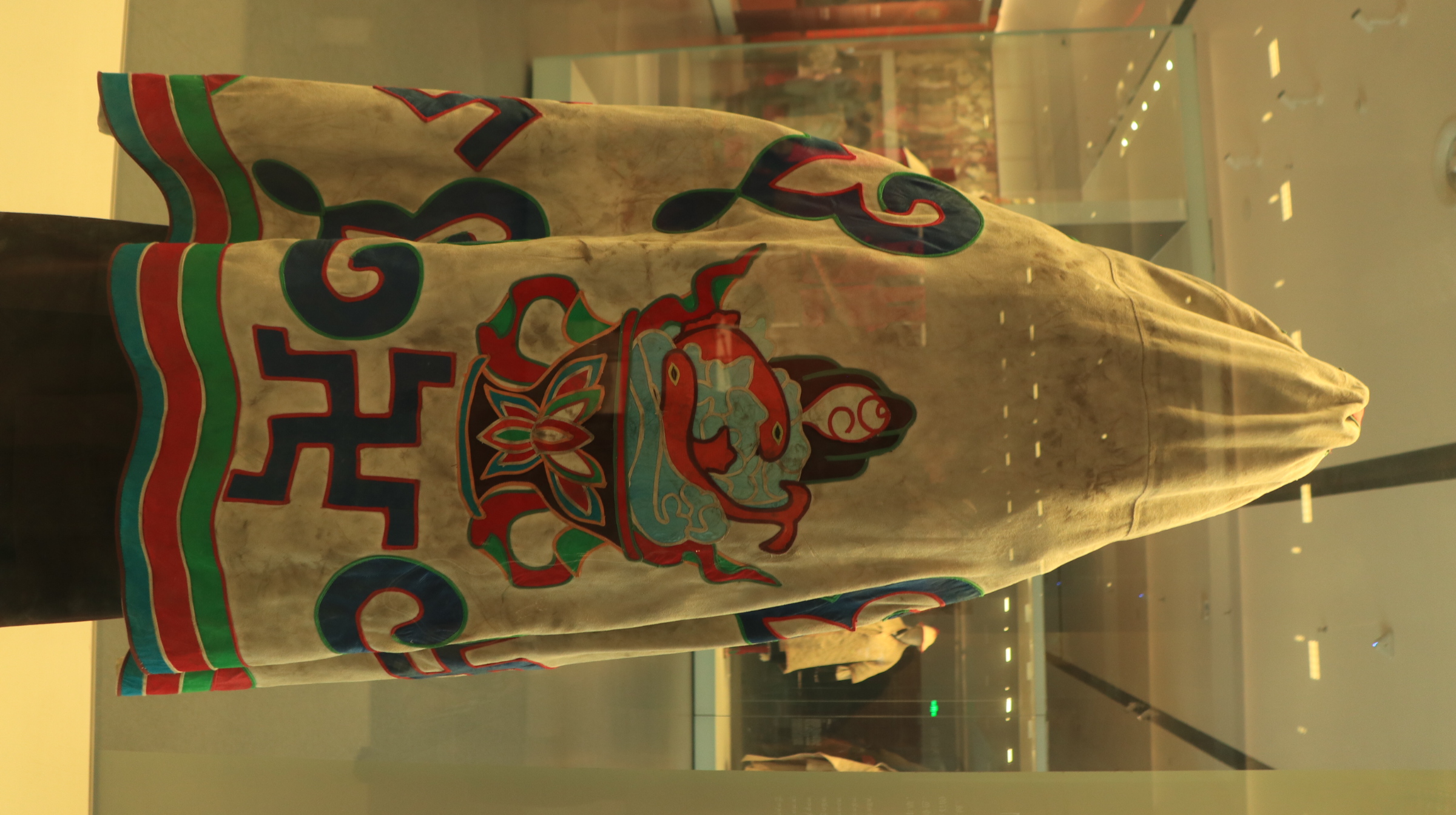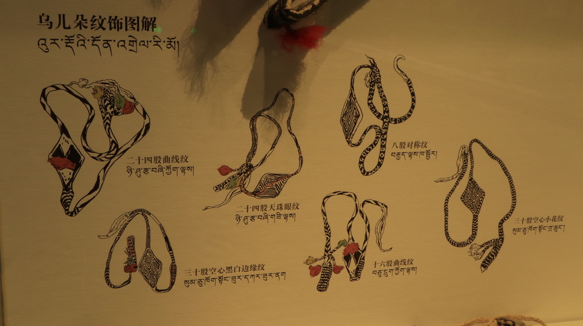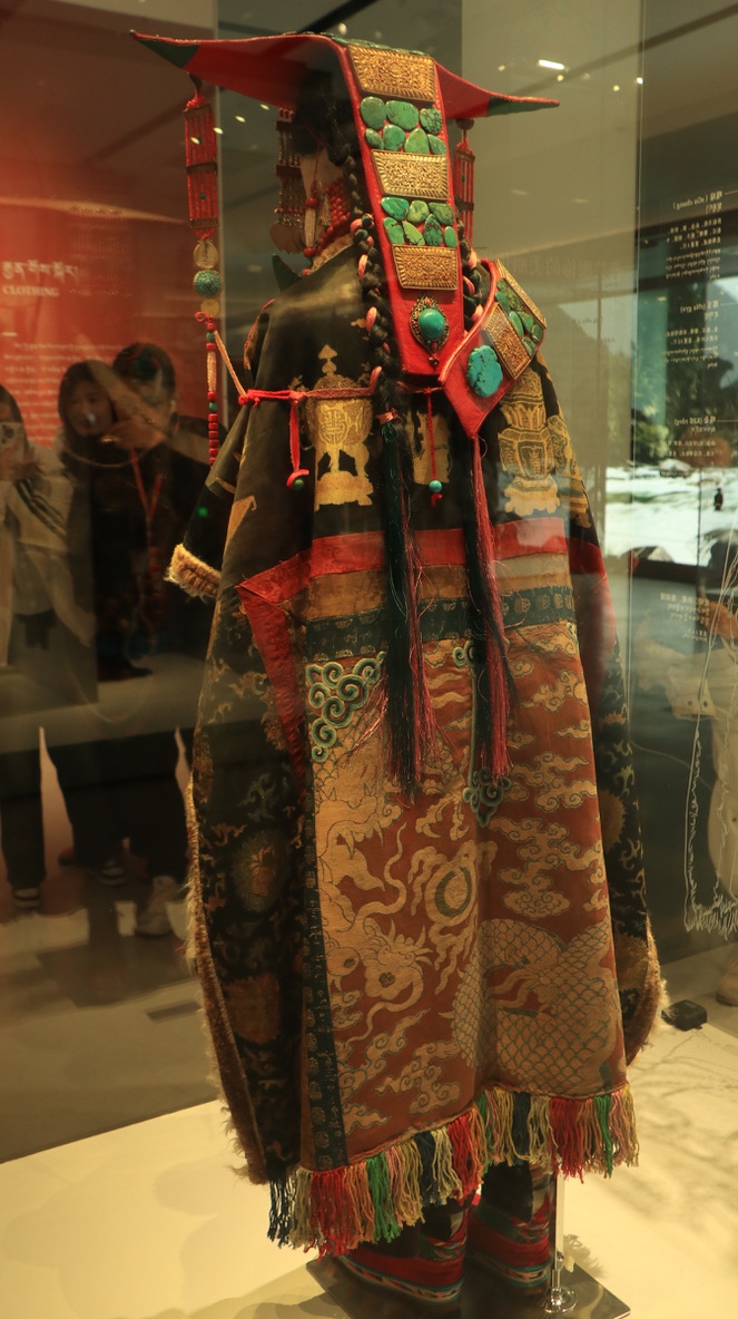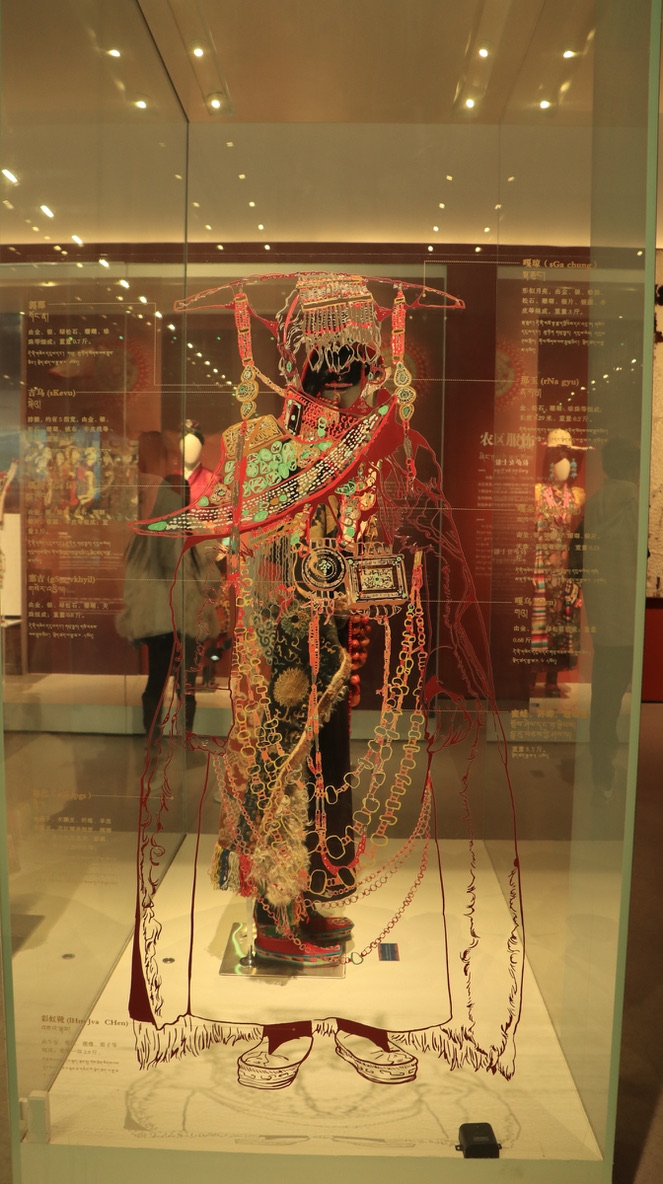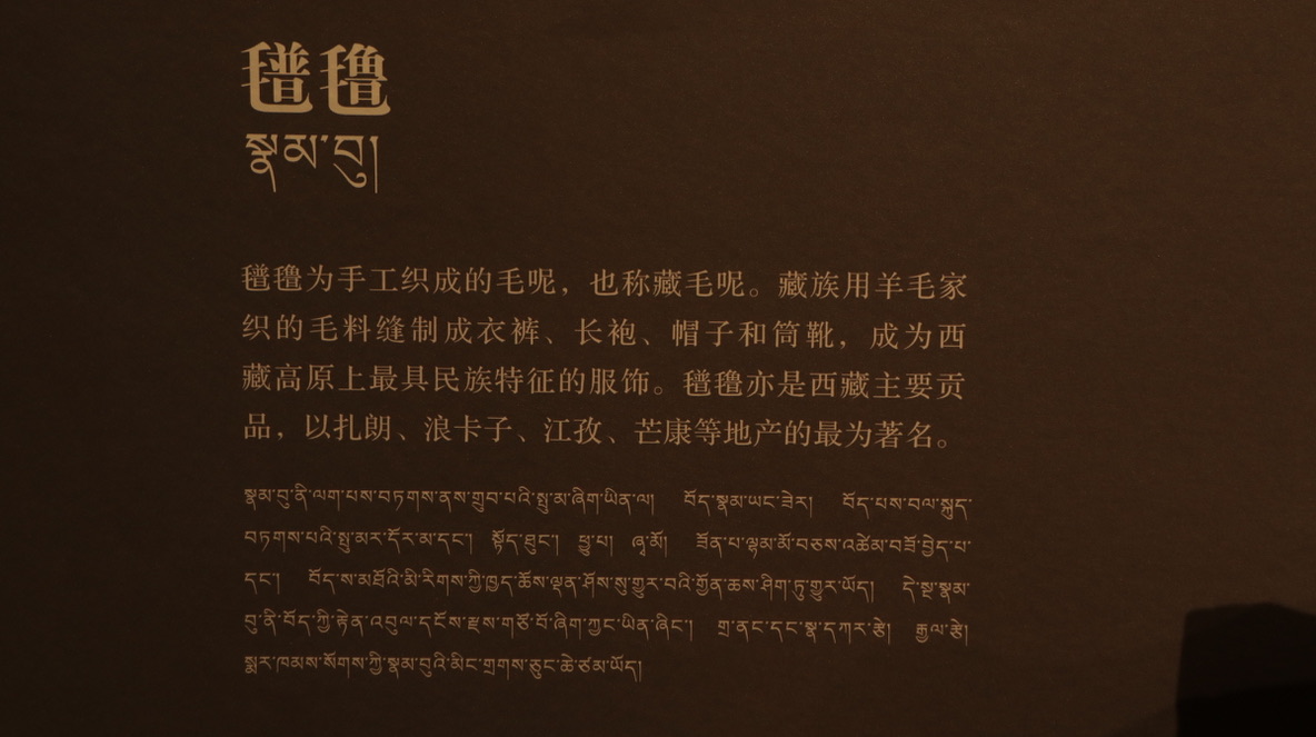 西藏牧区海拔高,风沙大,气温低,生活在那里的牧民用保暖御寒的皮毛制成宽袍长袖、穿着自如、便于行旅的皮袍。服饰上的手工刺绣纹饰多以动植物、日月星辰等自然元素为主。腰间佩戴的火镰、腰刀、针线盒等用具,不仅具有一定的装饰性,同时也反映出游牧文化的特点。