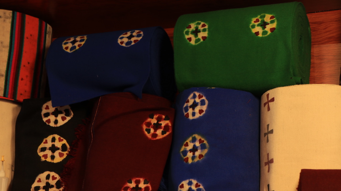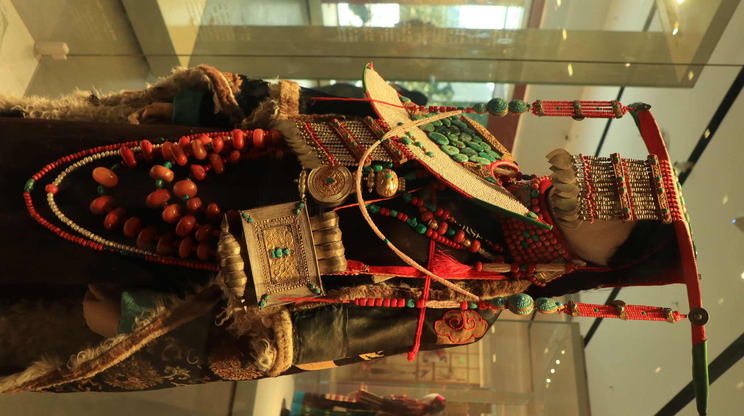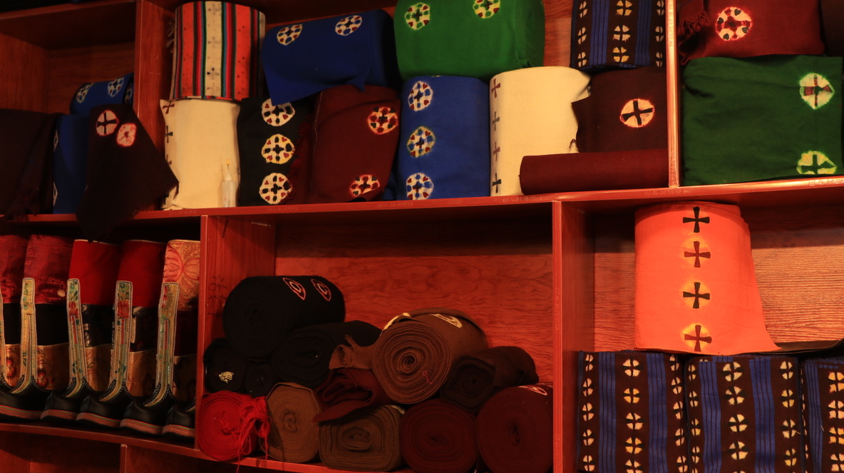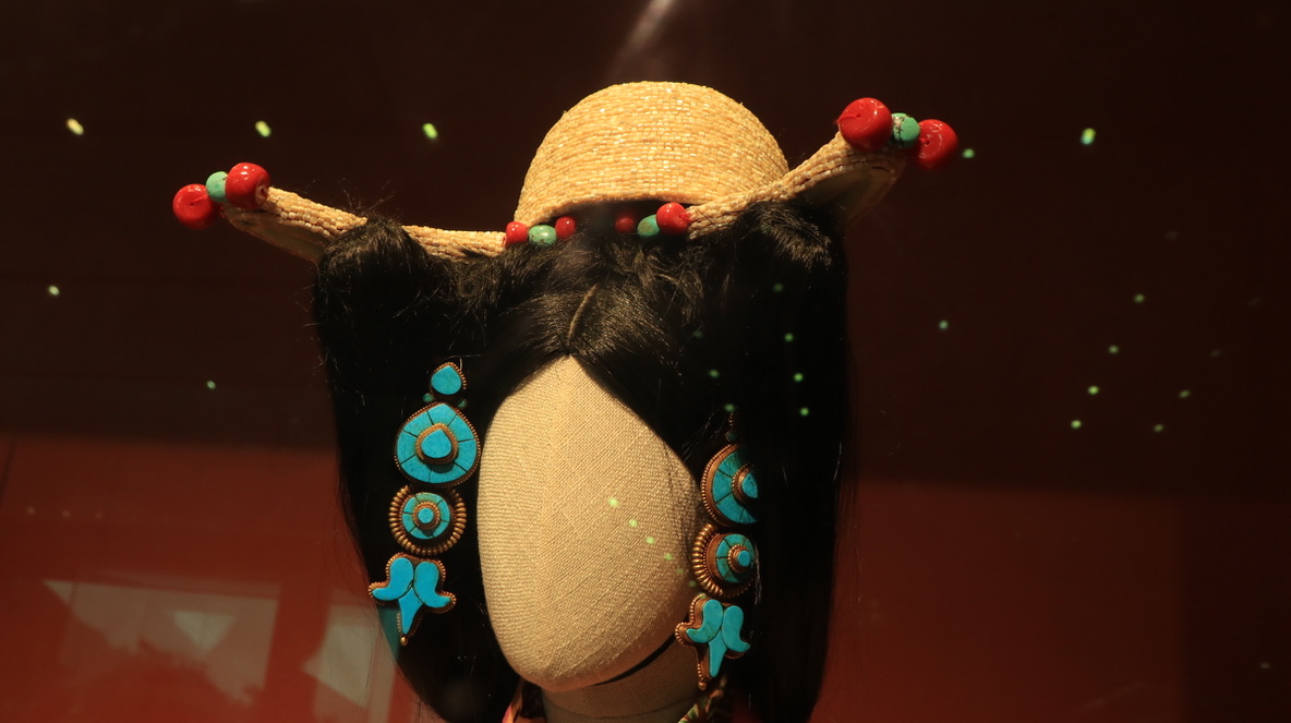 西藏牧区海拔高,风沙大,气温低,生活在那里的牧民用保暖御寒的皮毛制成宽袍长袖、穿着自如、便于行旅的皮袍。服饰上的手工刺绣纹饰多以动植物、日月星辰等自然元素为主。腰间佩戴的火镰、腰刀、针线盒等用具,不仅具有一定的装饰性,同时也反映出游牧文化的特点。