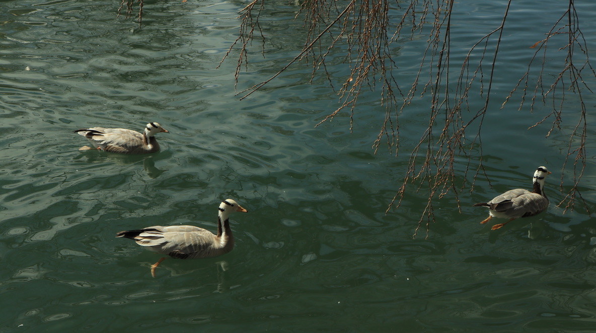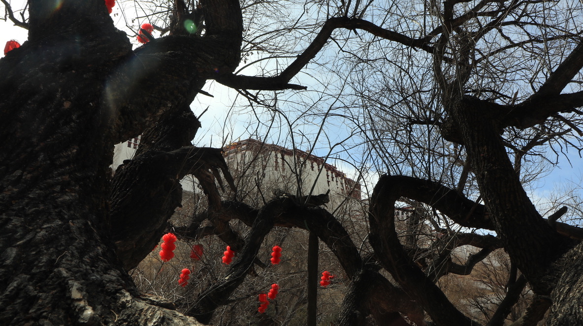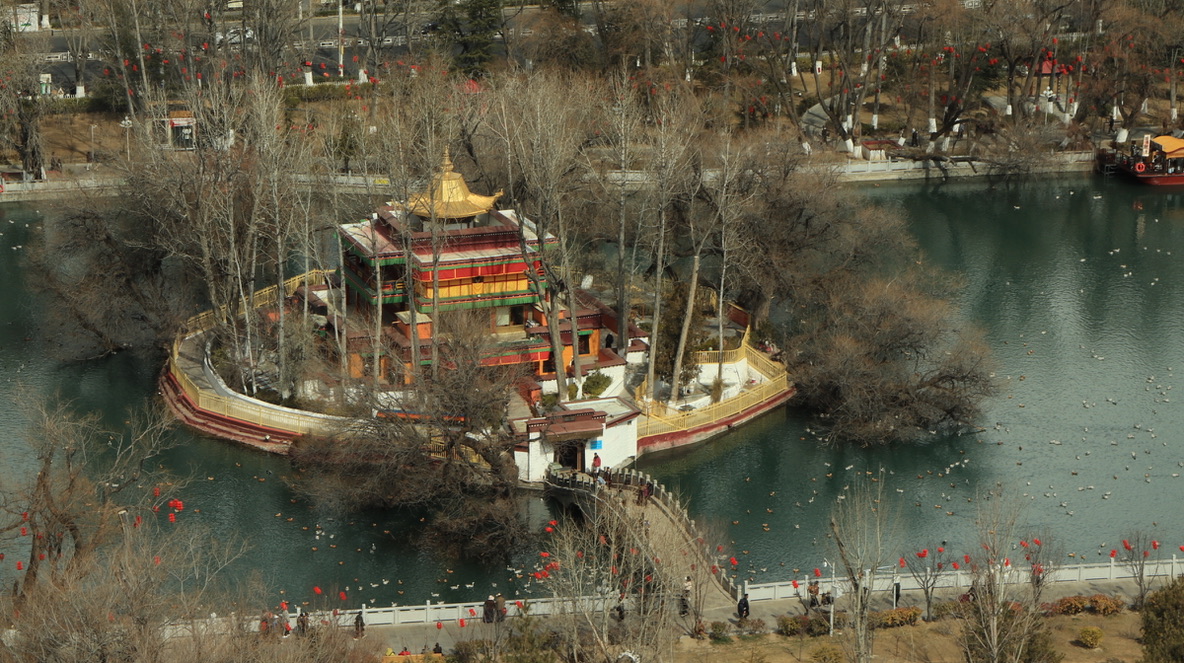 在宗角禄公园游船上晒太阳,看古树与鸭还有布达拉宫的倒影。
