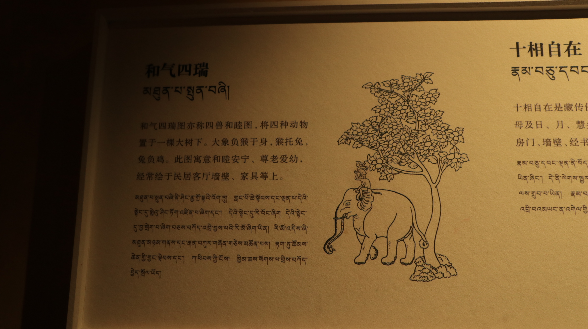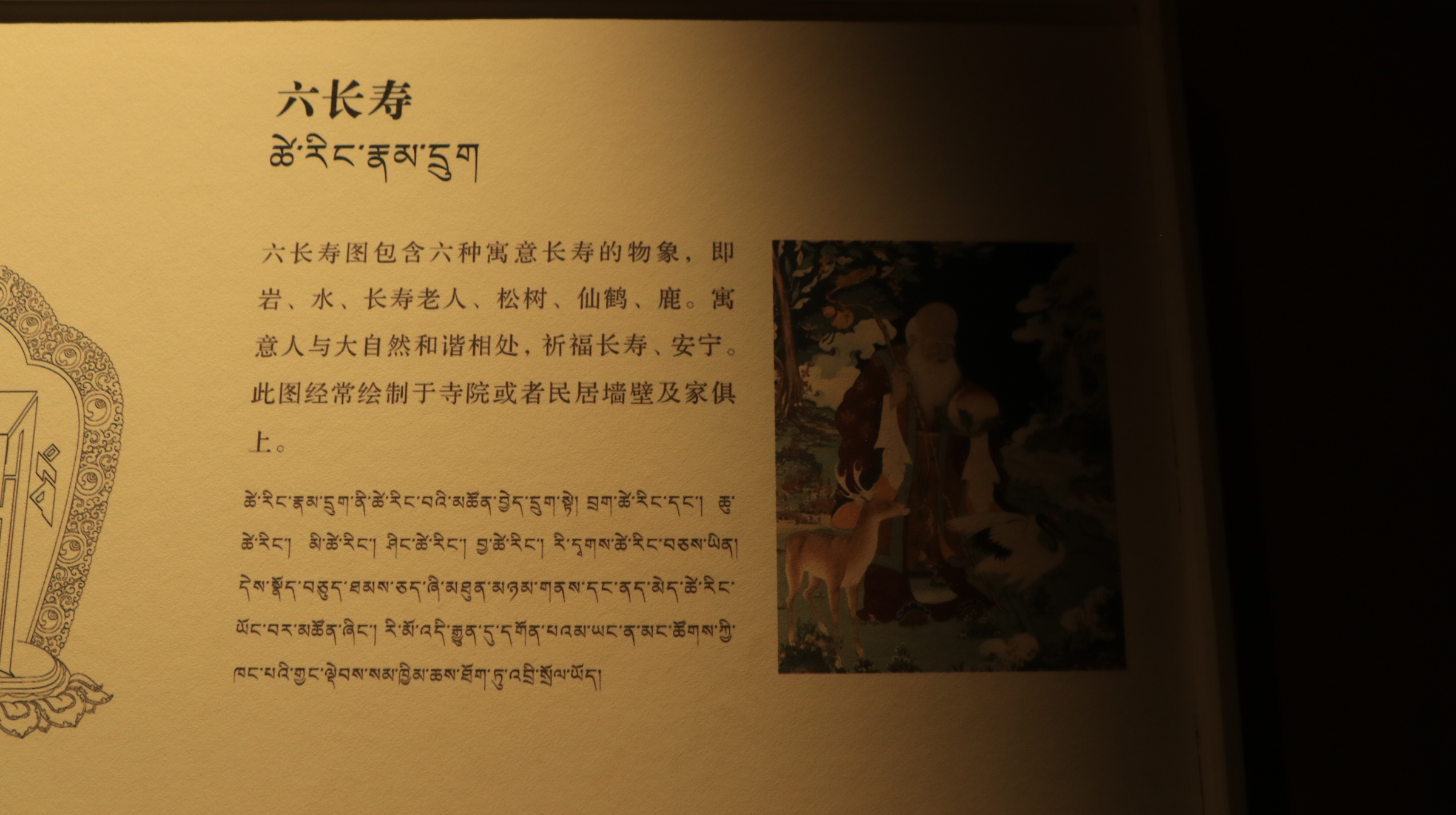 左右两侧是八吉祥图饰,在藏传佛教中,“八吉祥”(藏语称“བཀྲ་ཤིས་རྟགས་བརྒྱད།扎西达杰”)是一组非常受欢迎的象征符号。它们不仅常出现在寺庙建筑、唐卡和法器上,也融入了藏区百姓的日常生活。
