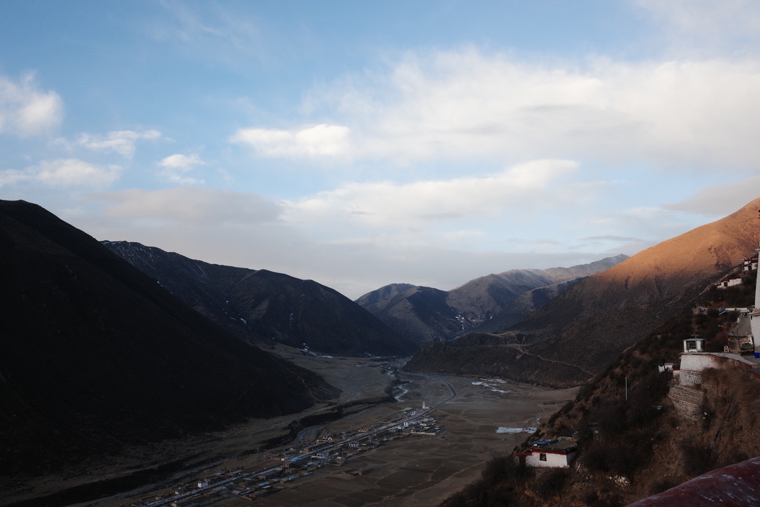 土黄色,碧绿色,红色,棕色,是这里大地与河流的颜色也是藏民穿着的颜色也是建筑的颜色。