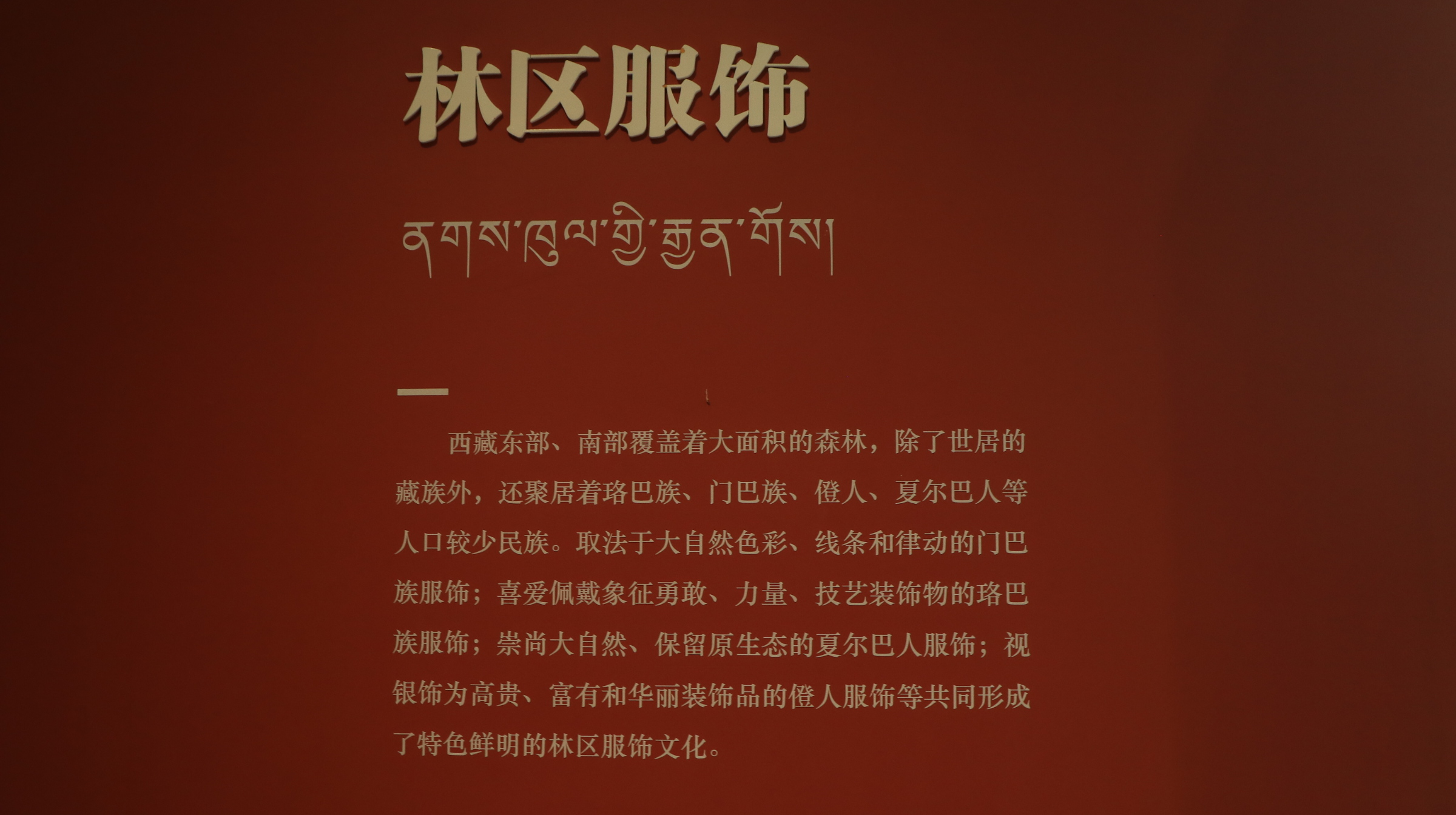 西藏东部、南部覆盖着大面积的森林,除了世居的藏族外,还聚居着珞巴族、门巴族、催人、夏尔巴人等人口较少民族。取法于大自然色彩、线条和律动的门巴族服饰;喜爱佩戴象征勇敢、力量、技艺装饰物的珞巴族服饰;崇尚大自然、保留原生态的夏尔巴人服饰;视银饰为高贵、富有和华丽装饰品的倦人服饰等共同形成了特色鲜明的林区服饰文化。