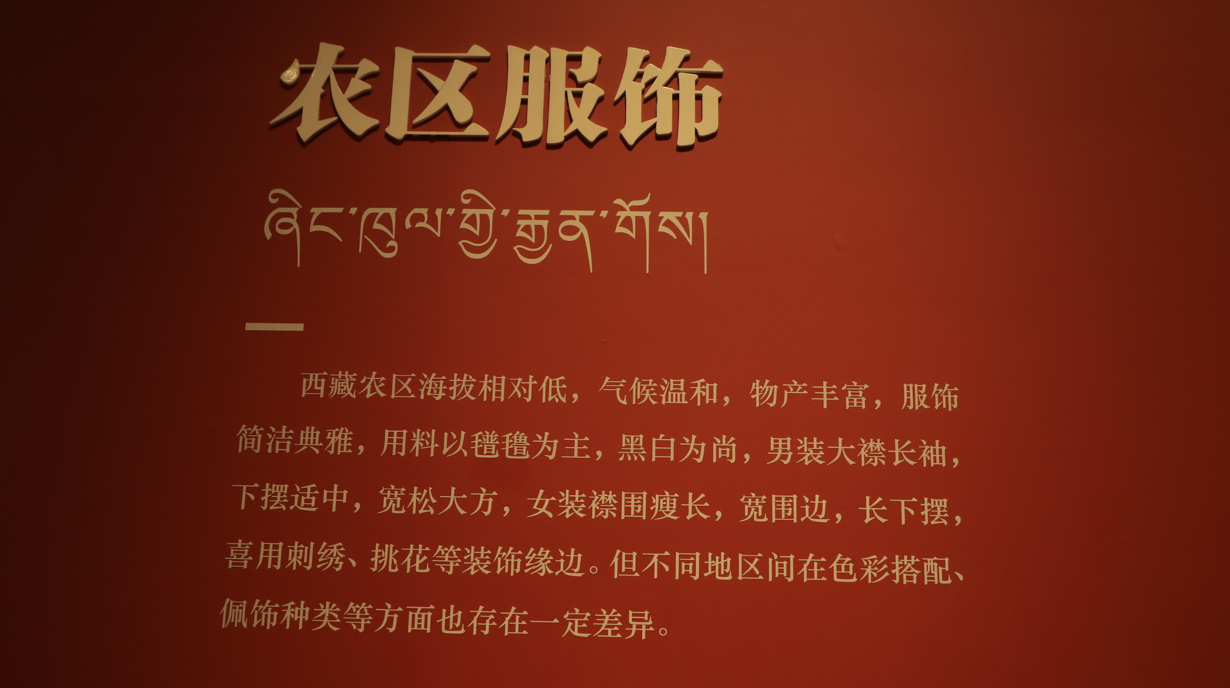 西藏农区海拔相对低,气候温和,物产丰富,服饰简洁典雅,用料以氆氇为主,黑白为尚,男装大襟长袖,下摆适中,宽松大方,女装襟围瘦长,宽围边,长下摆,喜用刺绣、挑花等装饰缘边。但不同地区间在色彩搭配、佩饰种类等方面也存在一定差异。